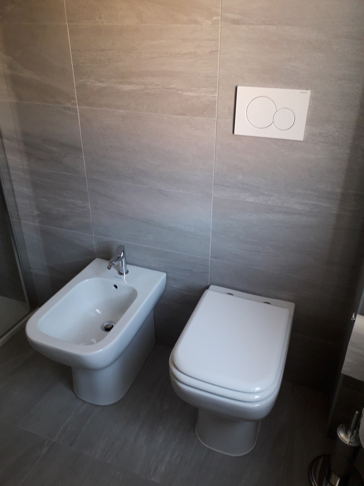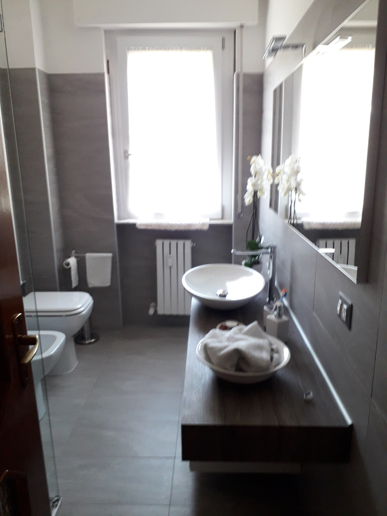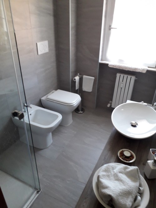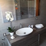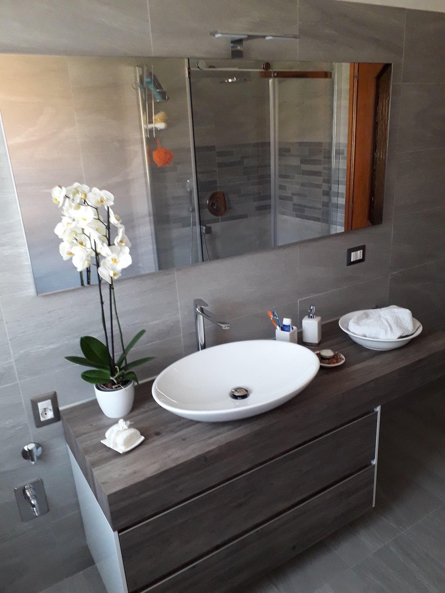 Bagno completamente ristrutturato in provincia di Como. Piastrelle in gres porcellanato tipo pietra formato 30x60cm (disponibili anche in altro formato) con inserti a mosaico in doccia, piatto doccia ardesia finitura natural  bianco 120x80cm, sanitari altezza maggiorata filo parete, rubinetteria cilindrica, box doccia in vetro 8mm con trattamento anti calcare con ingresso agevolato (privo di binario inferiore), mobile bagno sospeso in melaminico grigio engandina su misura, lavabo sopra piano appoggiato su consolle spessore 13cm, miscelatore a colonna e grande specchiera con illuminazione a led.